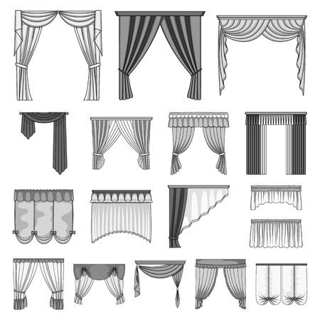 窓のカーテンの異なるタイプ カーテンセットコレクションアイコンをモノクロスタイルのベクトルシンボルストックイラストで表示します のイラスト素材 ベクタ Image