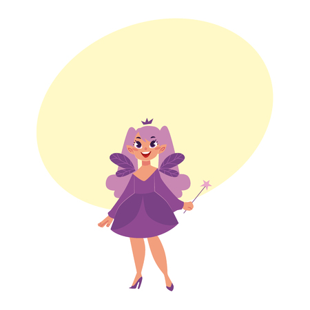 白い背景にベクトル妖精の女の子のイラスト バブルスピーチで女王の冠を身に着けている蝶の翼を持つかわいい 漫画笑顔の子供 マジック マジックスターワンドを持つ空飛ぶ子供 のイラスト素材 ベクタ Image
