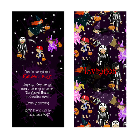 子供のハロウィン パーティーのかわいい招待状 妖精 魔女 死 Pirat 漫画のスタイルのイラスト コスチューム パーティーの招待状 ベクトル の イラスト素材 ベクタ Image
