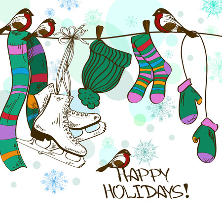 冬のイラストやカード スケート靴をぶら下げとロープにサンタの服を乾燥のイラスト素材 ベクタ Image